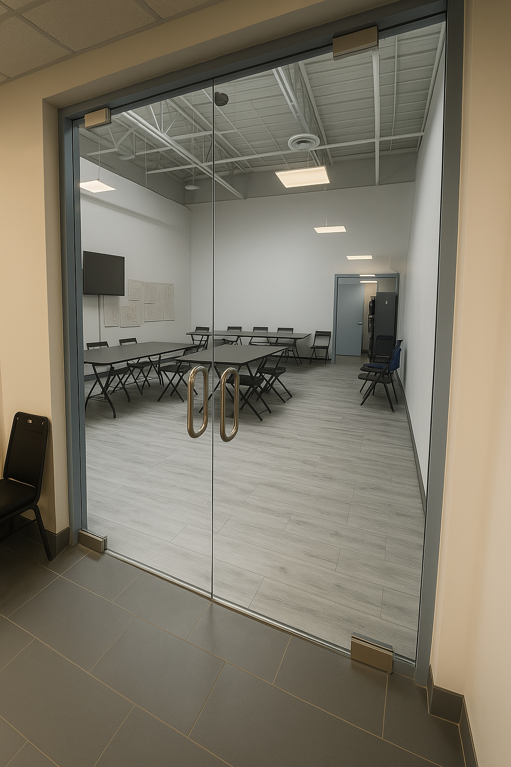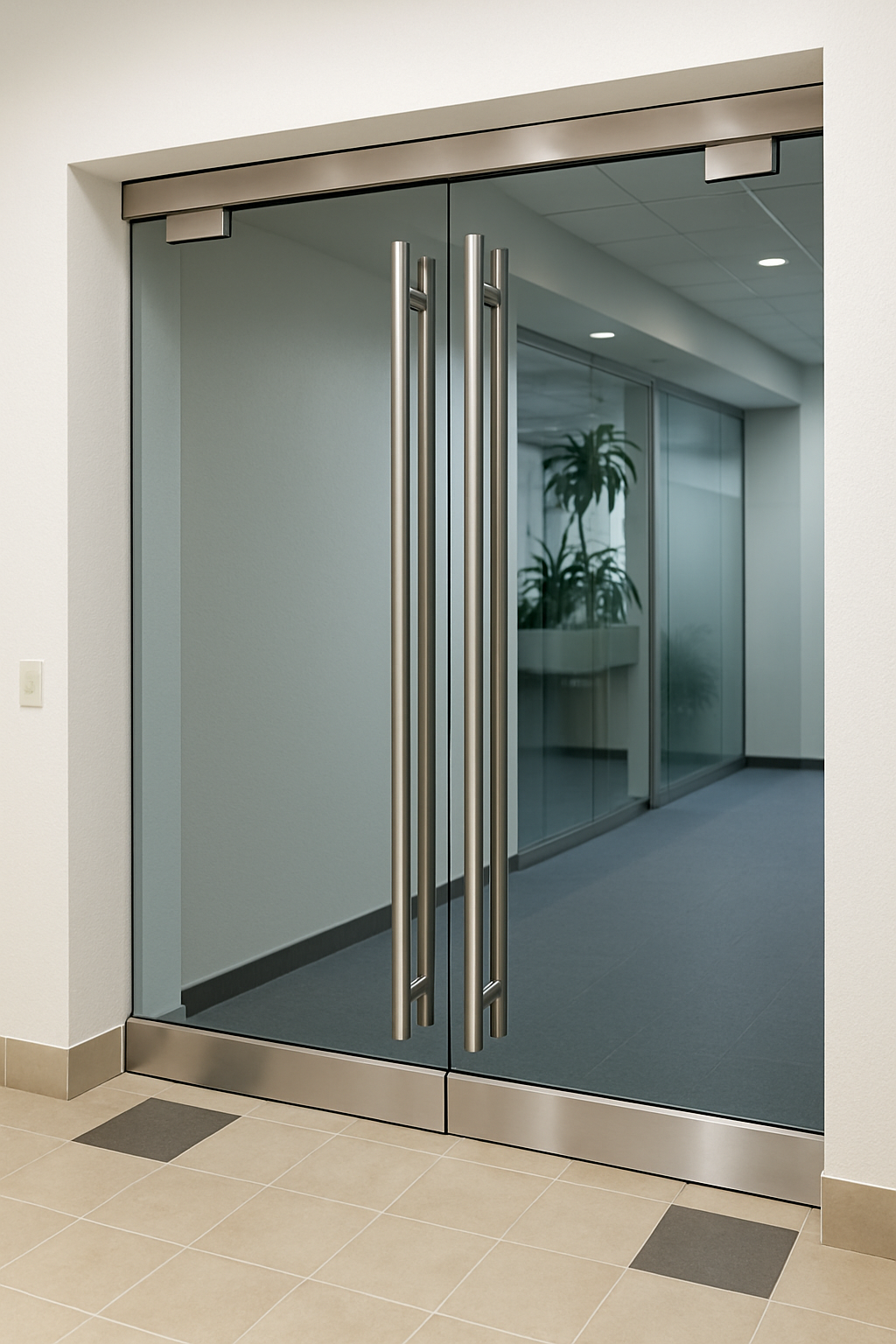 Glass doors can be equipped with self closing hinges, door locks, door pulls of various styles. They provide security and privacy and can open both in and out as required.